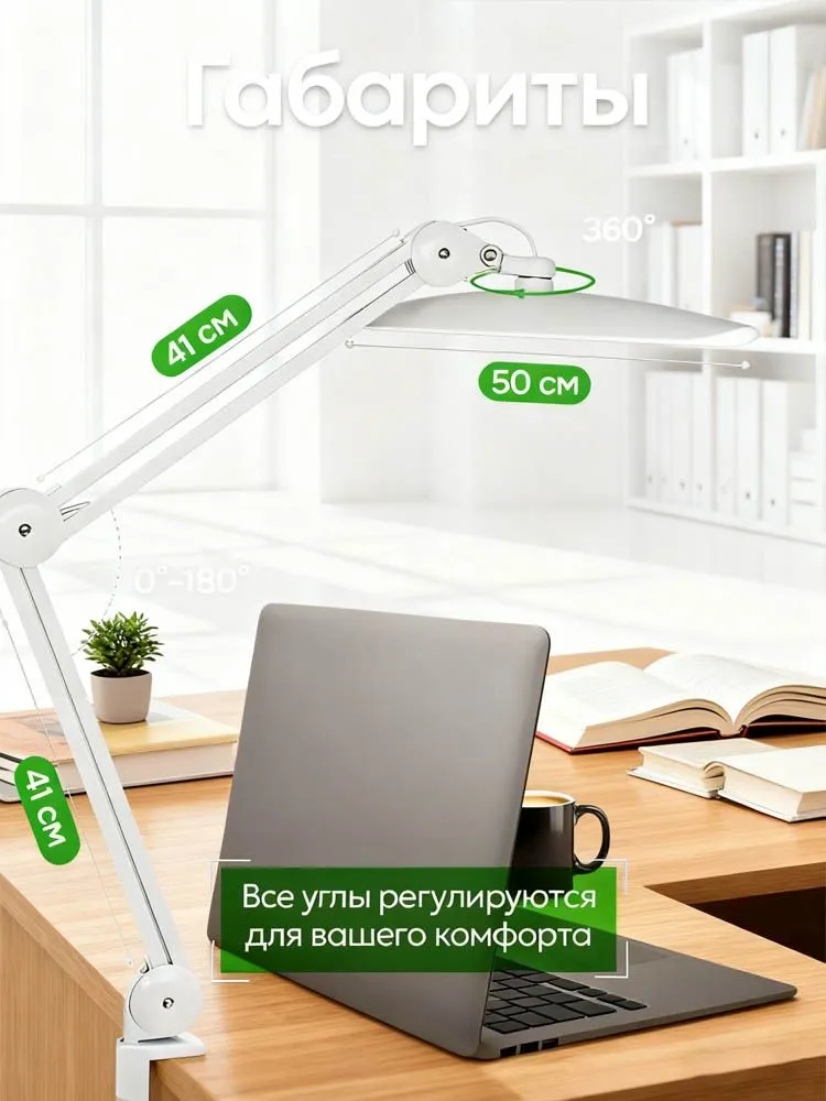 Оснащена легким пластиковым корпусом белого цвета с матовым рассеивателем спереди лампы. Широкий плафон обеспечивает освещение широкой рабочей зоны, а также создает направленный световой поток без отбрасывания тени. С помощью поворотного кронштейна можно установить светильник под любым углом, а усиленная металлическая струбцина гарантирует надежное крепление лампы, не занимая при этом много места. Блок питания в комплекте.
