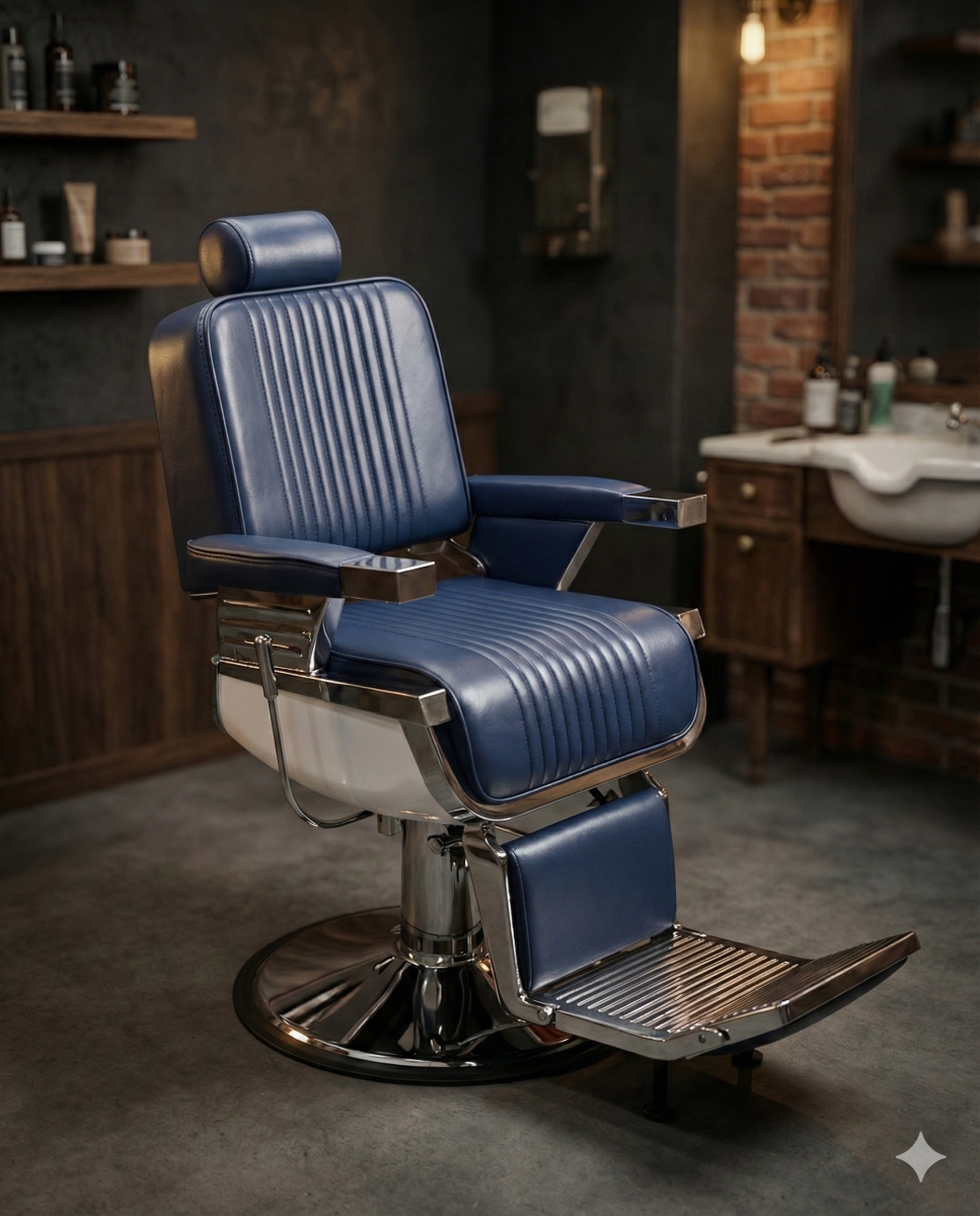 Глубокий тёмно-синий цвет обивки, вертикальная прострочка и хромированные детали делают кресло выразительным акцентом в интерьере барбершопа в стиле лофт, индустриал или неоклассика. На фоне кирпича, бетона и тёмного дерева такое барберское кресло сразу считывается как «мужская классика» и премиальный сервис.