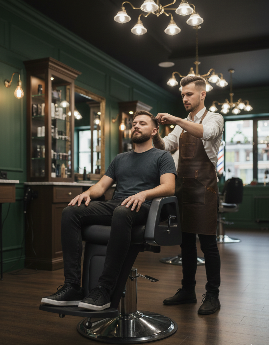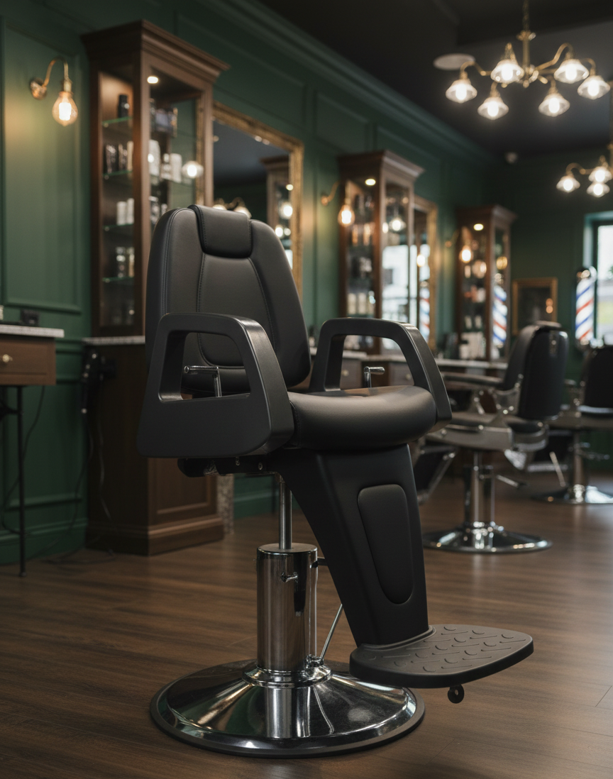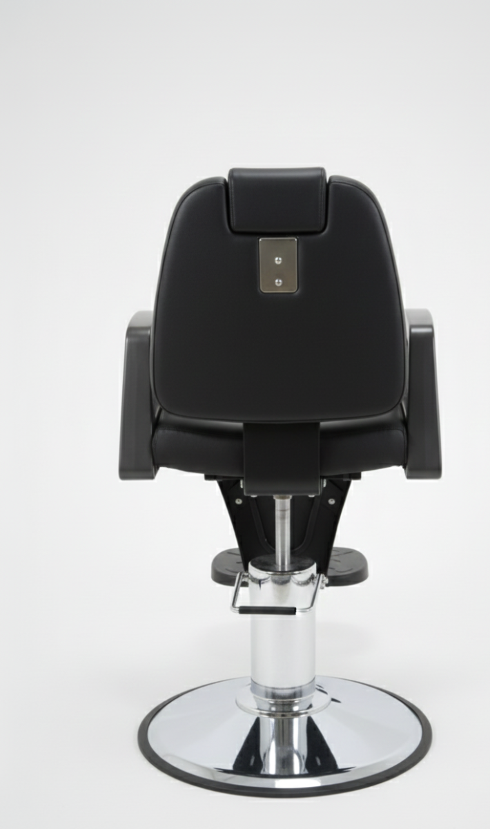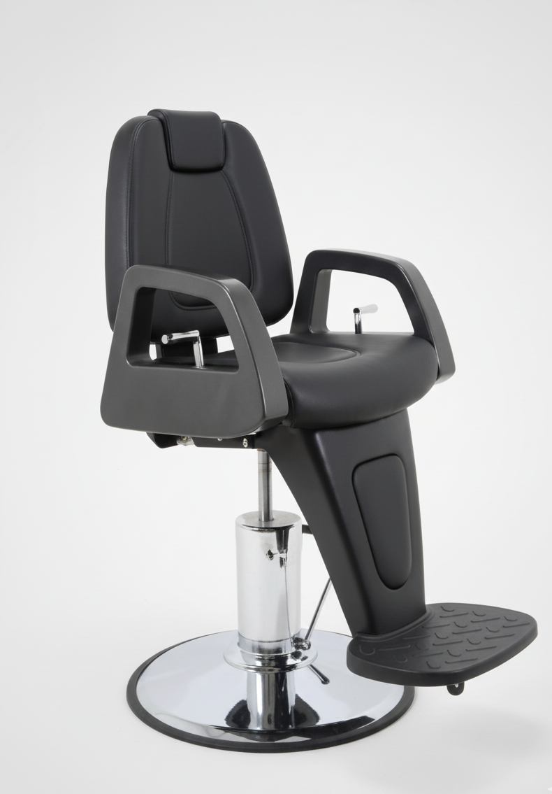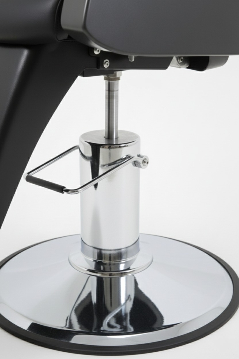 Стабильность при каждом движении: массивная опора в виде хромированного диска гарантирует, что кресло не шелохнется даже под весом самого крупного клиента. Никаких вибраций при работе с шейвером или опасной бритвой.