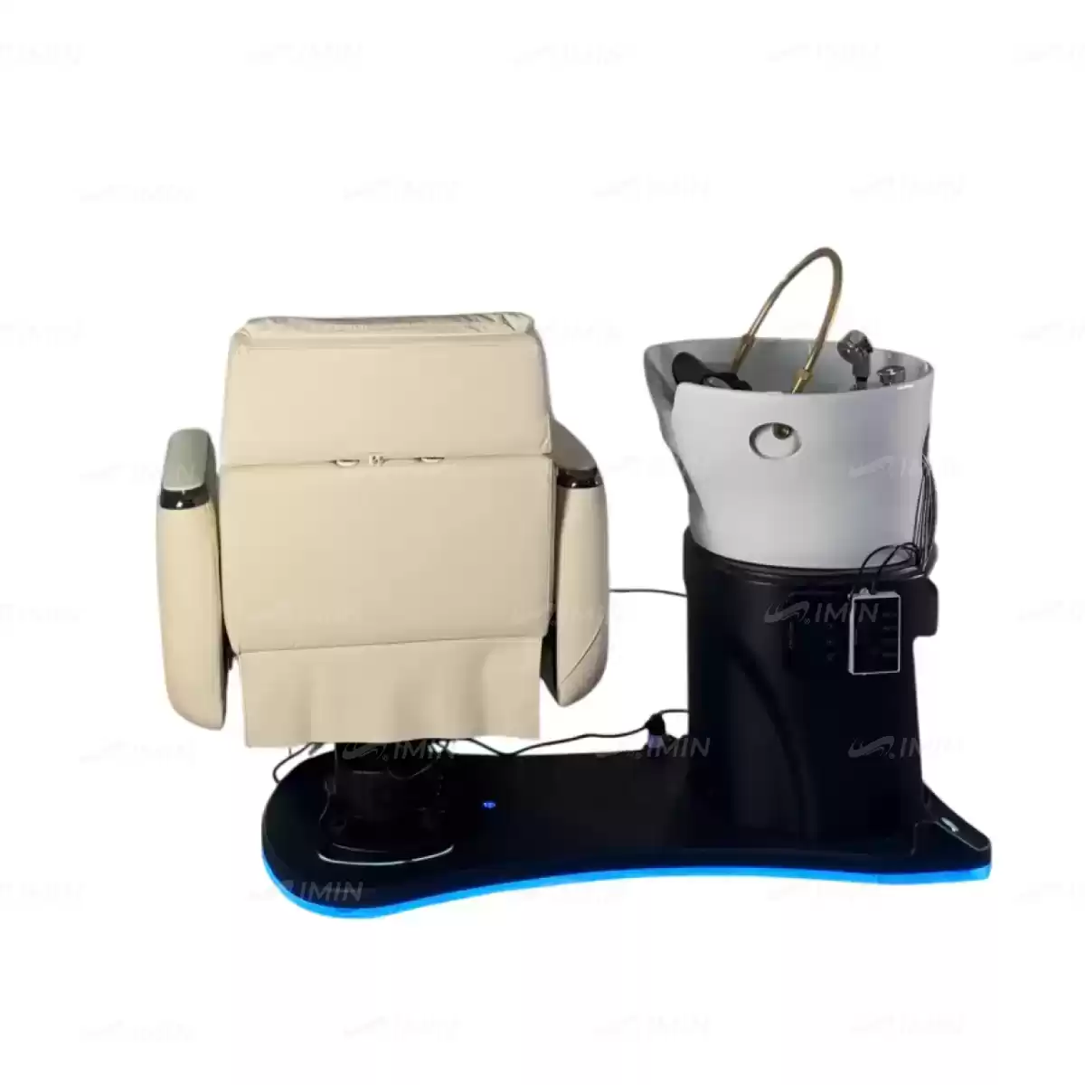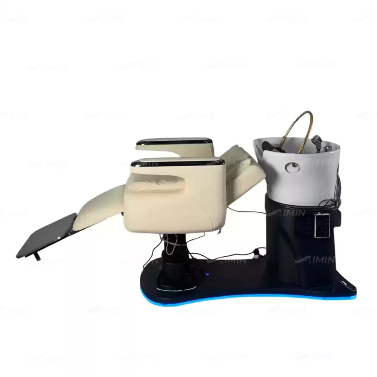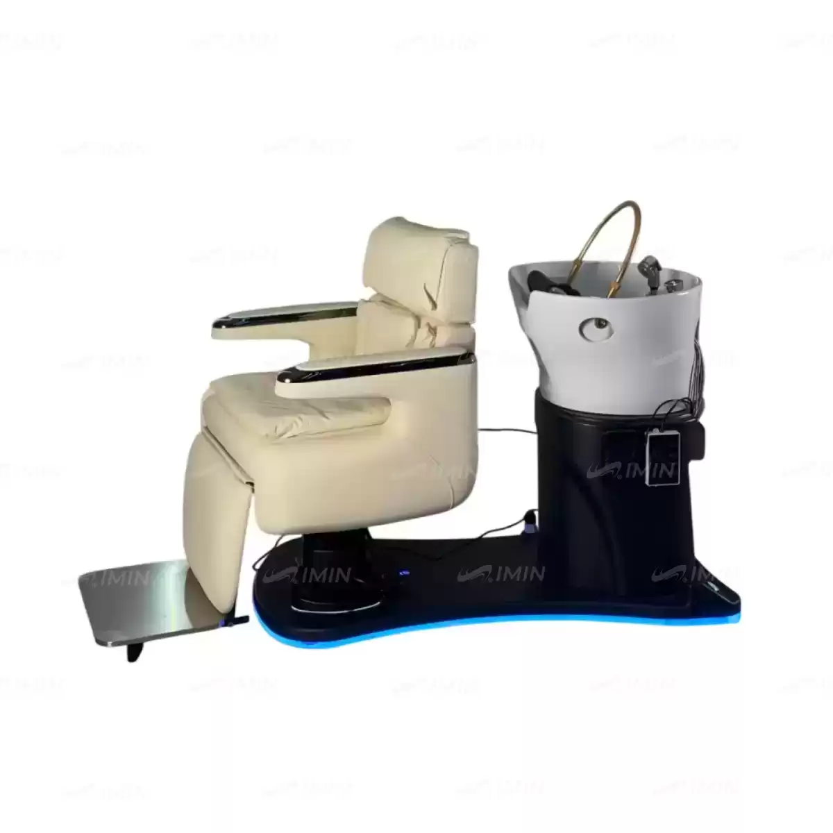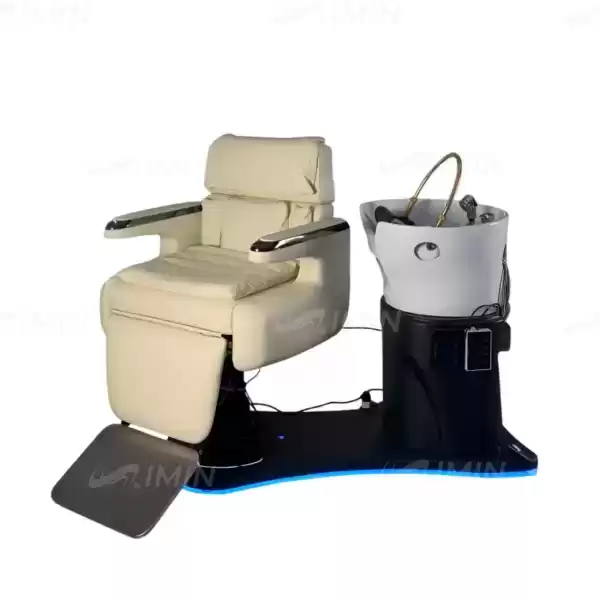 Парикмахерская spa-станция представляет собой инновационное многофункциональное оборудование, объединяющее в себе все этапы обслуживания клиента от стрижки до мытья головы благодаря уникальной поворотной конструкции. Станция вращается вокруг своей оси, плавно трансформируясь из рабочей зоны с регулируемым креслом в зону мойки с глубокой керамической раковиной, что позволяет мастеру выполнять процедуры без перемещения клиента. Кресло адаптируется под любые потребности: его высота регулируется с помощью ножных кнопок под основанием, положение легко меняется от сидячего до лежачего благодаря педалям со стороны раковины или интегрированной кнопке на боковой панели, а вращение вокруг оси обеспечивает удобный доступ ко всем зонам. Циркуляционная система раковины с подачей воды через регулируемую по высоте дугу гарантирует комфортное мытье, а встроенная подсветка корпуса создает расслабляющую атмосферу. Дополнительная универсальность достигается за счет съемных элементов — подножья и изголовья с возможностью настройки, что делает оборудование универсальным для различных техник ухода и требований клиентов.